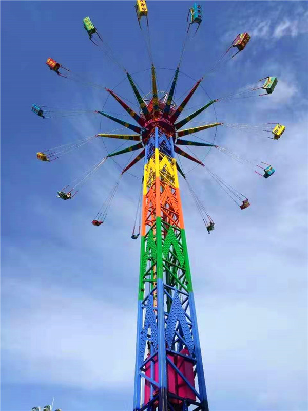 夜晚来临,其高耸的塔身,在游乐园中更显尊贵;五彩的灯光,在随乘客旋转运动中,犹如一道道彩虹当空舞,更显绚丽夺目,富丽缤纷。