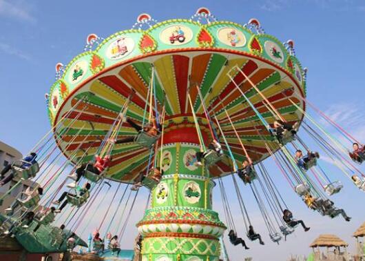 游乐设备旋转飞椅是一种新颖的飞行塔类游乐设施,豪华的外观装饰,有趣的运动形式。游客乘坐在垂挂的吊椅上,随转盘的运转徐徐升起,仿佛翱翔于天际,又如置身于波荡起伏的大海中,其乐无穷。游客座椅在离心力的作用下绕立柱起伏飞旋,好似银燕在晴空中回旋飞舞,此起彼伏,上下飘飞。他集娱乐性、趣味性,惊险和刺激性于一体。